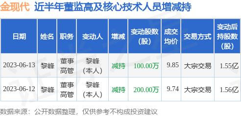 证券之星讯,把柄6月14日商场公开信息、上市公司公告及交往所潜入数据整理,金当代(300830)最新董监高及联系东说念主员股份变动情况:2023年6月13日公司董事,高管黎峰共减捏公司股份100.0万股,占公司总股本为0.2325%。变动时间公司股价上升4.71%,6月13日当日收盘报11.33元。